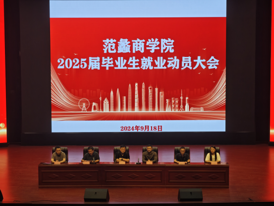 本网讯(通讯员/杜培龙)为扎实推进2025届毕业生就业工作,不断提升毕业生就业质量,落实就业工作目标责任,9月18日晚,范蠡商学院在东校区音乐厅召开2025届毕业生就业动员大会。学院党委书记闫合占、党委副书记李冬生、副院长党政军出席会议,学院2025届毕业生辅导员及全体2025届毕业生参加会议。