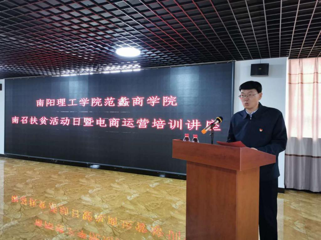 本网讯(特约记者/李浩)在第七个全国“扶贫日”、第二十八个“国际消除贫困日”到来之际,2020年10月17日上午,在南阳理工学院张伟副书记的带领下,校团委书记郭兴华、范蠡商学院书记张良、副院长吕晓军、部分教师代表等在南召县电子商务产业园会议室举行南召扶贫活动暨电商运营培训讲座,活动由南召县宝天曼电子商务有限公司副总经理曹培主持,南召县电子商务协会副秘书长李晓雪,及南召县电子商务产业园各企业代表等100多人参加此次活动。