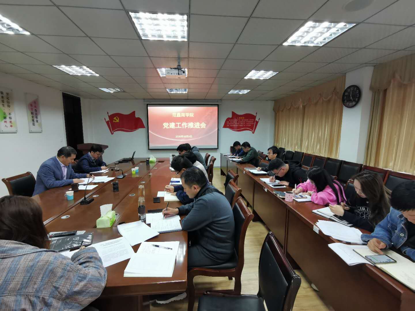 本网讯(通讯员/赵明铎)10月6日下午,学院党委书记张良主持召开范蠡商学院党建工作推进会。学院班子成员和各支部书记参加。张良传达了学校党建工作推进会上刘荣英书记的讲话精神,要求各支部认真落实校党委提出的“三大任务”,实现“四个一流”建设目标,以党的建设高质量促事业发展高质量。随后安排了基层党支部“两化一创”建设自查工作,要求各支部严格对照《党支部建设“两化一创”强基引领三年行动计划第二阶段建设情况自查表》,认真自查,找出存在问题,立即进行整改,积极申报评定校级“样板党支部”,争创省级“样板党支部”。下一步学院要召开党建工作专题会,建立和完善各项党建制度,补齐制度短板,严格落实党建制度,脚踏实地搞好党建工作。