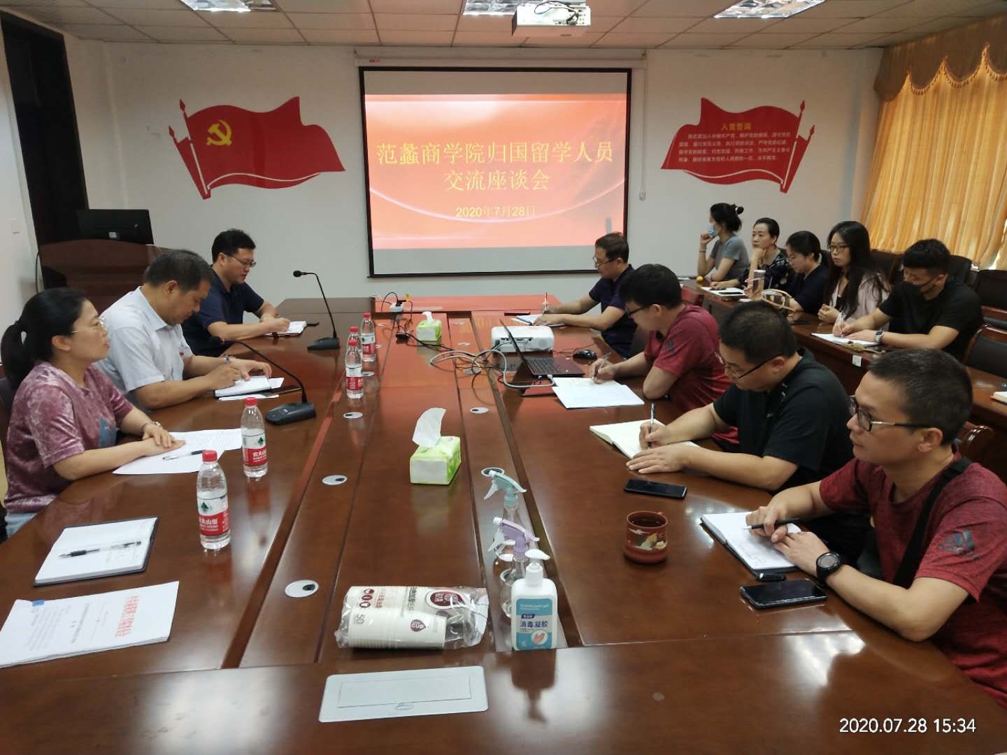 本网讯(特约记者吕晓军)7月28日下午,范蠡商学院在1号楼331会议室召开归国留学人员交流座谈会,学校统战部副部长马丹,党外人才科科长梁旭峰、范蠡商学院党委书记张良、院长吴战勇、归国留学人员等参加会议。