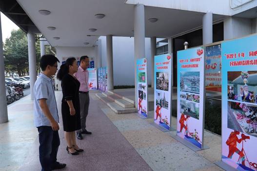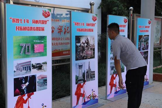 本网讯(通讯员/张凯威)为喜迎新中国成立七十周年,贯彻落实习近平新时代中国特色社会主义思想和党的十九大精神,加强学校各民族师生之间的交往交流交融,促进民族团结进步,营造和谐融洽、全面发展的校园民族文化氛围,由校党委宣传部、校党委统战部指导,电子商务学院主办,民族团结进步社团“同心社”协办的“辉煌七十年同心共筑梦”摄影展在我校领创空间前集中展出。