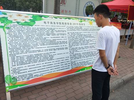 在电商学院迎新点,不时有新生在教师寄语展板面前驻足阅读,来自海南的19级新生陈景盛阅读后说:“读完这些寄语,我感受到老师们对我们的殷切祝福,大学四年我一定会珍惜时光,过一个多姿多彩的大学生活。而且我感觉老师们一定都很可爱,我已经迫不及待见到他们了!”