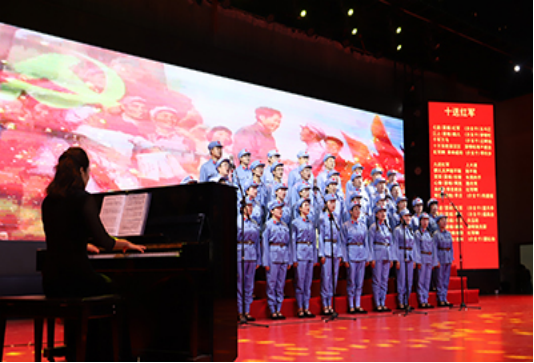 伴随着激情四溢的现场指挥和钢琴师的深情伴奏,电子商务学院合唱团身着庄严军装登台引吭高歌!一首耳熟能详的红色经典歌曲《十送红军》,在合唱团的演唱下成功将现场观众带入那个军民团结共抗外敌的历史现场;另一首铿锵有力的《保卫黄河》又将观众带回到战火纷飞的革命战争年代。电商合唱团磅礴的气势、美妙的歌声、真情的礼赞、激情充沛的旋律让每一位现场观众都沉醉其中,赢得现场观众的阵阵掌声。