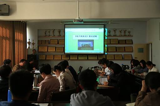 在会议中向全体教师表示了对电子商务未来发展的强烈信心,并强调了一人外出学习全体教师受益方法的必要性。(摄影/彭金凤)