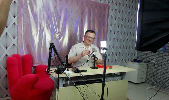 看到一名学生“网红主播”正在直播间通过直播销售南阳艾产品,那乌莫夫·亚历山大·鲁多利福维奇校长拿起相机连连拍照,然后直接走进另一间直播室,戴上麦克风,手拿南阳艾条,现场体验“网红主播”的感觉;科斯特罗马国立大学国际合作顾问兼外事处长卡拉什尼克•维克多•彼得洛维奇也进行了体验。