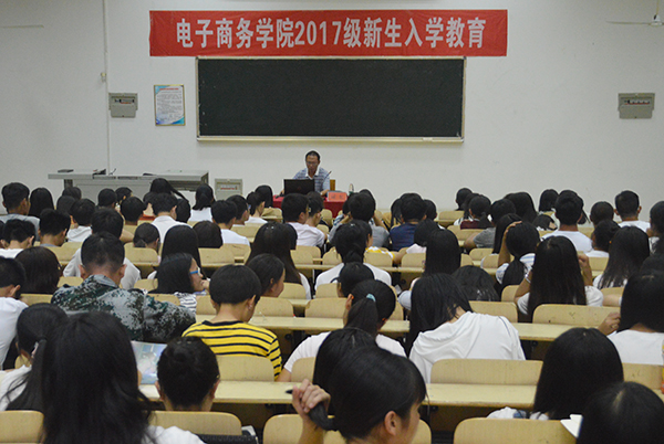本网讯(通讯员/沈成凤)9月13日晚,电子商务学院2017级新生入学教育第二讲在7号教学楼101教室开讲,电子商务学院党总支书记逯忆主讲,来自全国19个省市区的300多名2017级新生参加。