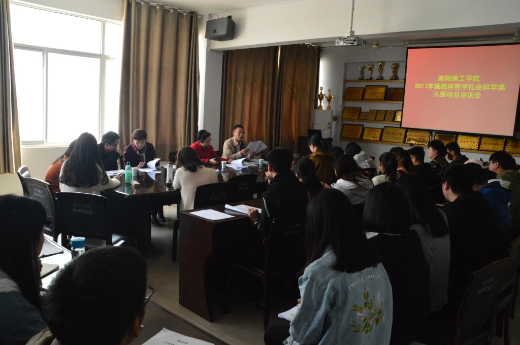 4月12日,南阳理工学院2017年“挑战杯”哲学社会科学类入围项目培训会在电子商务学院9教会议室召开,校团委副书记郭兴华、经济管理学院副院长李晓霞、电商学院党总支书记逯忆及各项目指导老师出席会议,会议由逯忆主持。