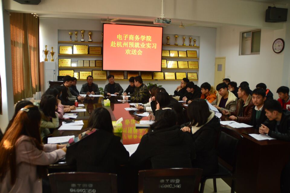本网讯(通讯员/张军峰)2月23日,电子商务学院在9教会议室召开赴杭州预就业实习欢送会,电商学院党总支书记逯忆、副院长吴战勇、郭永奇、团学办主任白林驰及14级辅导员赵杰出席欢送会,2014级电子商务专业的41名实习生参加。
