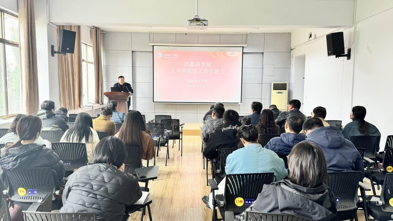 3 月 13 日,范蠡商学院党委在 1215 会议室组织召开2025 年上半年党建工作专题推进会,学院领导班子成员、各党支部书记及委员等参会,党委书记闫合占主持会议。