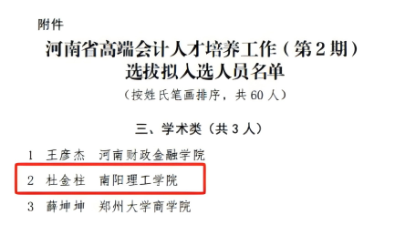 本网讯(特约记者/韩正)近日,河南省财政厅正式公布河南省高端会计人才培养工作(第2期)选拔拟入选人员名单,全省共计60人入选,其中企业类31人、行政事业类19人、注册会计师类7人、学术类仅3人。我校范蠡商学院杜金柱博士凭借扎实的专业功底、突出的科研能力与良好的社会影响力,成功入选学术类人才,成为全省入选的三位学术类代表之一,也是南阳地区唯一入选高校教师。