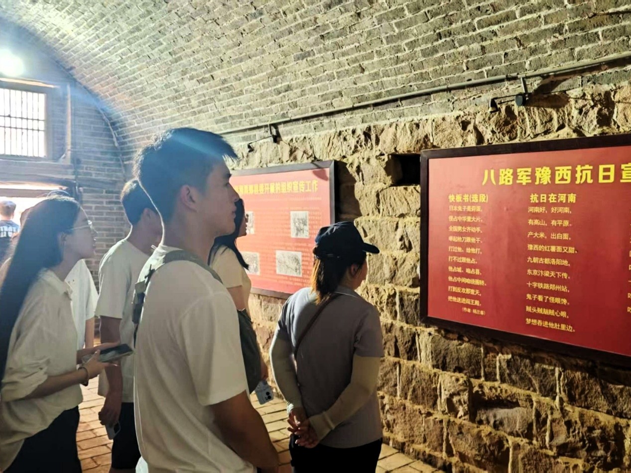 接着,为进一步深化资助育人成效,赓续红色血脉,团队成员专程前往郏县豫西抗日根据地曹沟旧址,开展了一场深刻的“踏寻红色之旅”主题教育活动。在馆内,队员们认真聆听讲解,重温了豫西地区波澜壮阔的抗战历史,深刻感悟革命先辈的奋斗精神与崇高理想。团队成员面向党旗庄严宣誓,表达了坚定理想信念、矢志跟党走的决心。