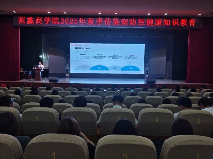 本网讯(通讯员/王君依)2025年9月15日19:20,范蠡商学院在毕业大厅组织全体新生开展2025年秋季传染病防控健康知识教育讲座。讲座特别邀请了校医院医生担任主讲,范蠡商学院大一新生参加此次讲座。