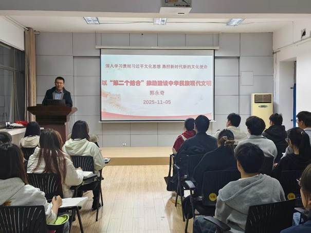 郭永奇围绕“第二个结合”的核心内涵展开讲解,系统阐述了马克思主义基本原理同中华优秀传统文化相结合的历史逻辑、理论逻辑与实践逻辑。强调这一重大论断不仅巩固了中华文化的主体性,更为青年成长提供了根本思想指引。勉励同学们既要筑牢马克思主义的理论信仰,也要扎深中华优秀传统文化的精神根基;既要锤炼专业本领,也要涵养责任担当。