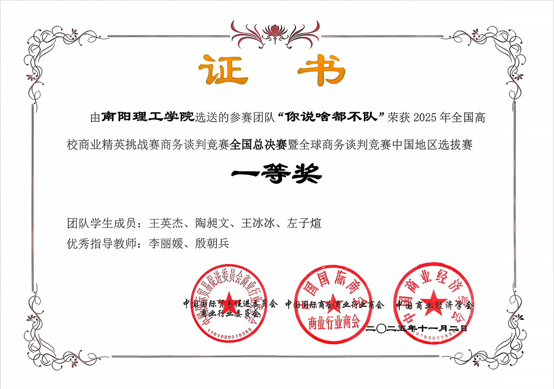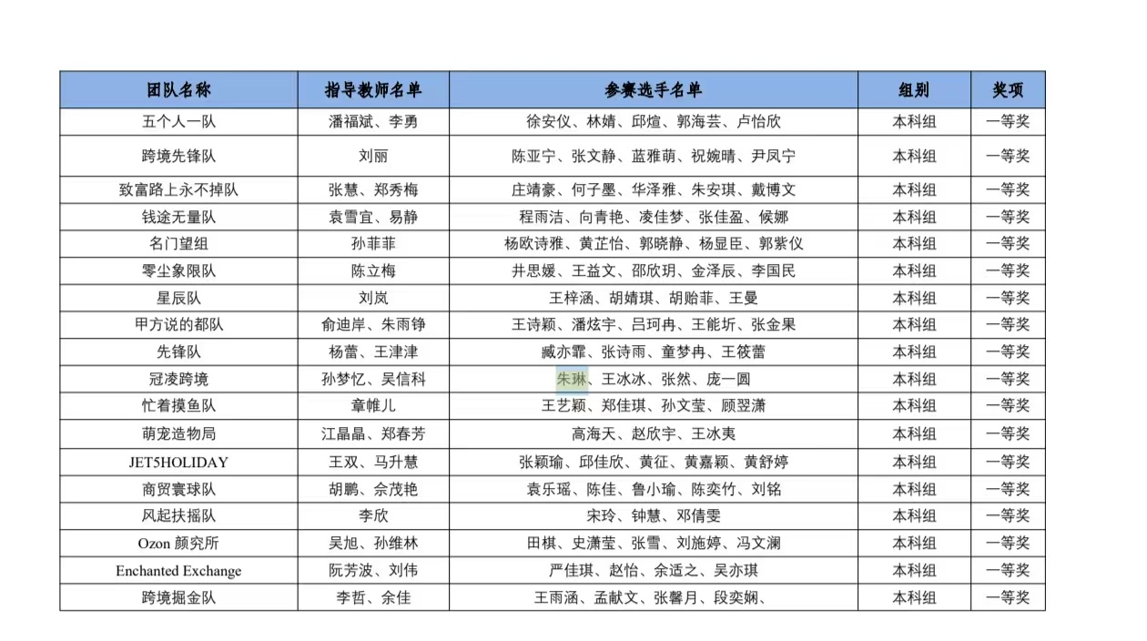 在2025年全国高校商业精英挑战赛系列赛事中,学院参赛团队捷报频传,整体成绩再创新高。据统计,学院在国际贸易竞赛(跨境电商赛道、RCEP国际市场开拓策划赛道、国际贸易与商务专题赛道、技术性贸易措施与标准国际化赛道、涉外商事法律服务赛道)共获全国一等奖8项、二等奖1项、三等奖4项;在创新创业竞赛中获全国一等奖1项、二等奖4项;在商务谈判竞赛中获全国一等奖1项、二等奖2项;在物流与供应链管理竞赛中获全国一等奖1项、二等奖3项;在品牌策划竞赛中获全国二等奖4项。累计取得国家一等奖11项、二等奖14项、三等奖4项的优异成绩,充分展现了范蠡学子扎实的专业素养与创新实践能力。