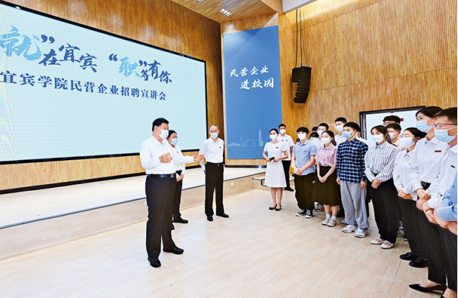 2022年6月8日,中共中央总书记、国家主席、中央军委主席习近平在四川考察。这是8日下午,习近平在宜宾学院考察时,向正在参加企业招聘宣讲会的教师、学生、企业负责人了解企业招工需求和毕业生签约率等情况。 新华社记者 李学仁/摄