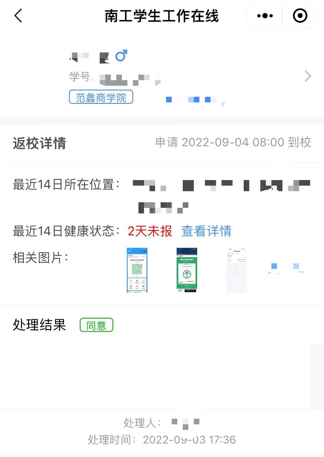 2022级新生入校前,须在南工在线上提交返校申请,上传48小时内核酸检测阴性证明、健康码、行程卡等证明材料,并在办理入校手续后按照规定进行三天两检。我院严格落实疫情防控要求,为学院学子的健康保驾护航。