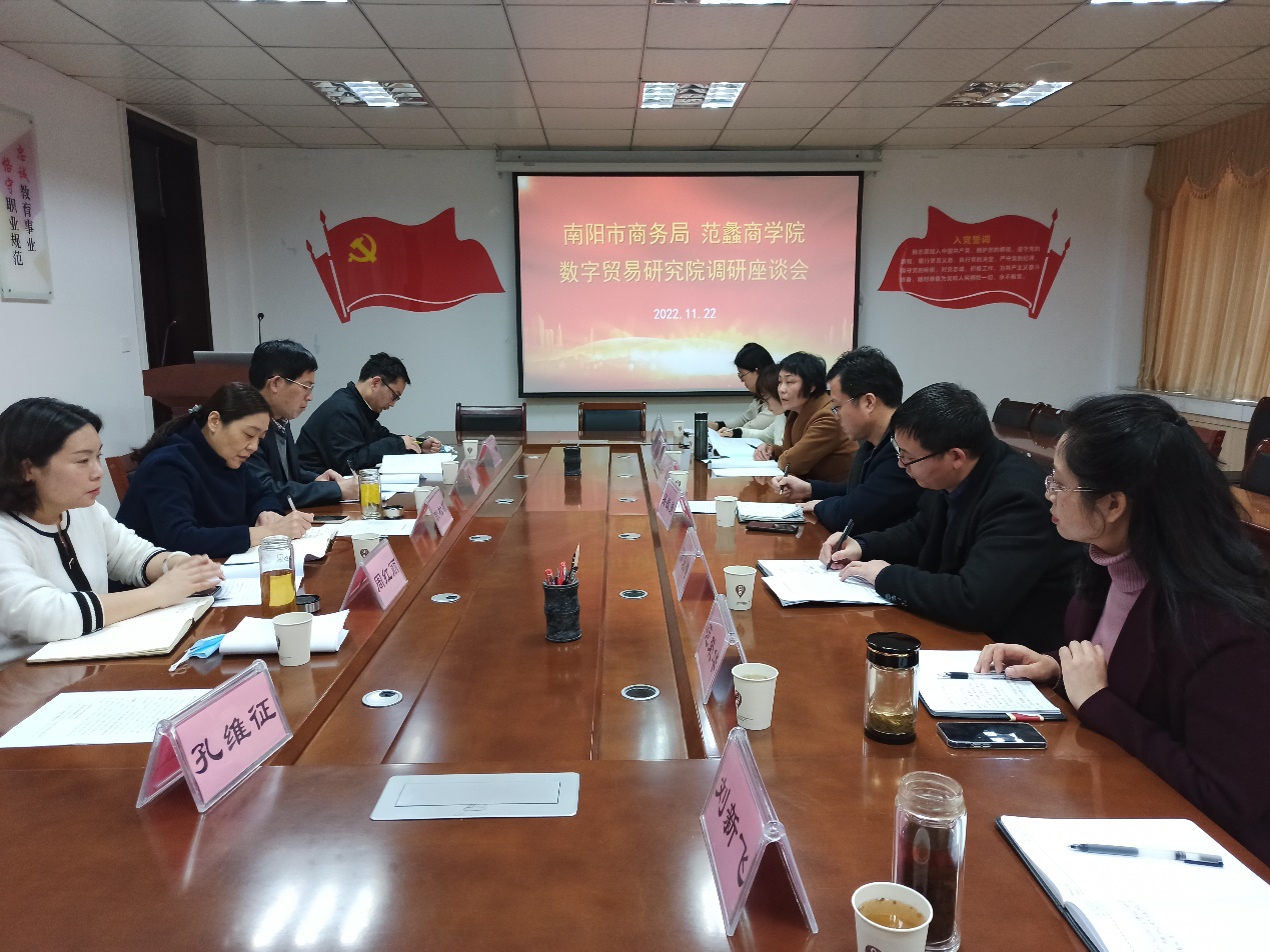11月22日下午,南阳市商务局党组成员、副局长耿松颖,电商科科长周红丽,电商中心主任孙中勋,物流科副科长孔维征,散装办副主任薛彦峰一行就成立数字贸易研究院事宜来到范蠡商学院调研座谈。学院党委书记张良,院长吴战勇,副院长郭永奇及部分骨干教师陪同调研。