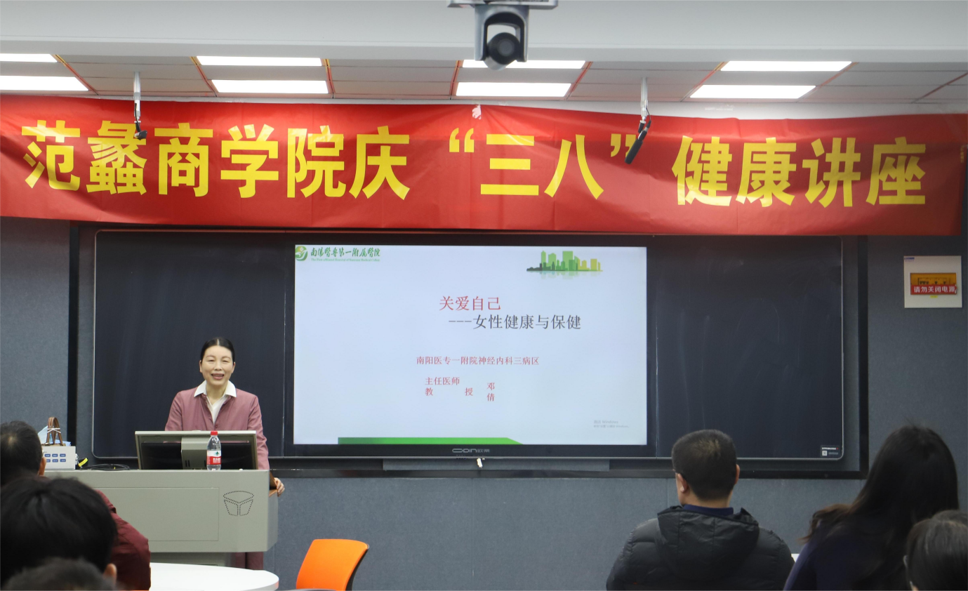学院邀请了南阳医专第一附属医院主任医师邓倩为我院全体教职工开展了“关爱自己一女性健康与保健”女性健康知识专题讲座。讲座中,邓医生就生活中常见多发疾病、慢性疾病等做出了详细介绍,并向大家普及面对疾病应该如何预防与调理,为大家上了理论知识丰富、操作指导性强的健康知识课。