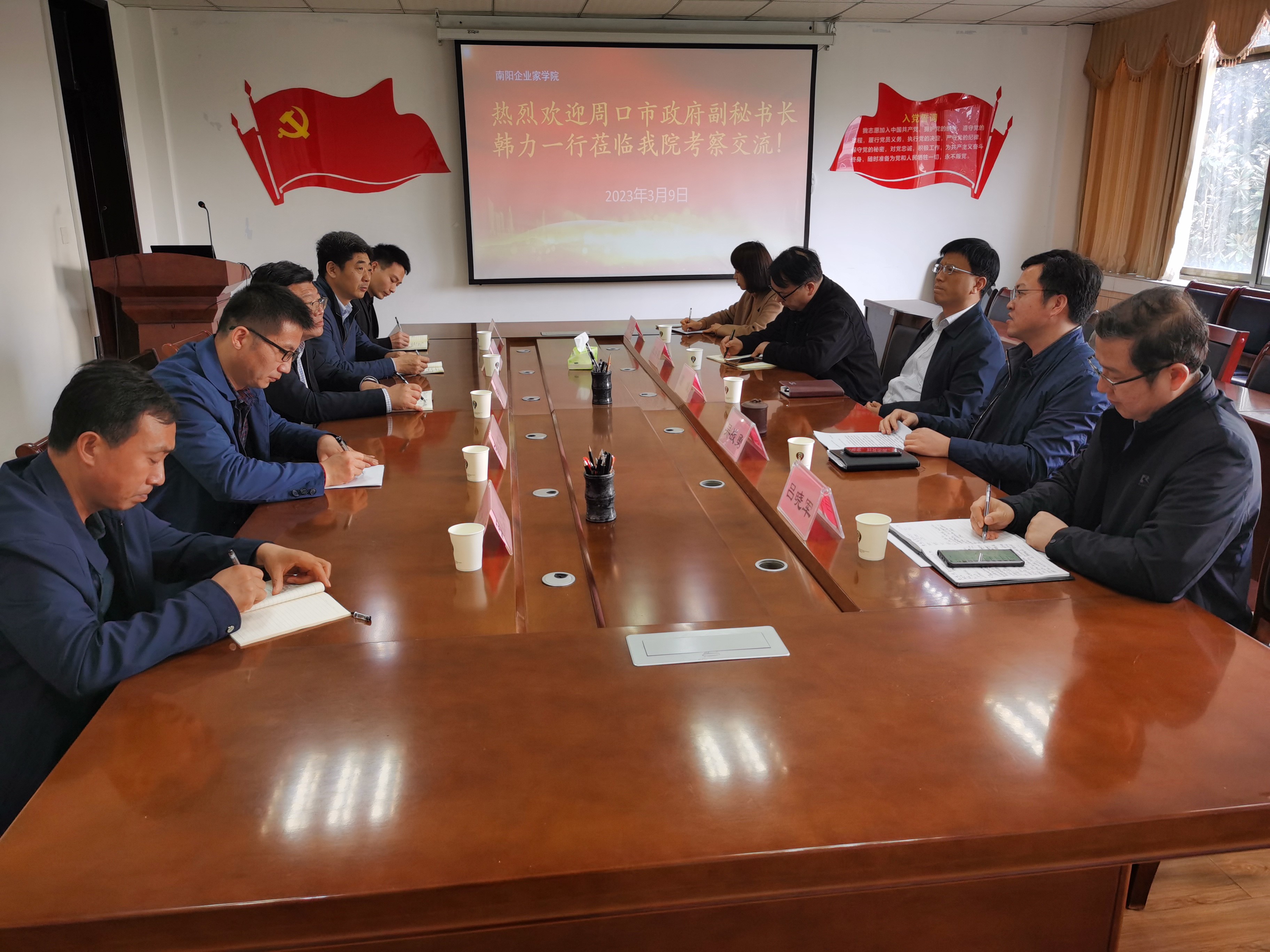本网讯(特约记者/李玉)3月9日,周口市政府副秘书长韩力一行来我校考察南阳企业家学院建设。南阳市政府副秘书长葛斌,范蠡商学院院长、南阳企业家学院院长吴战勇等出席了考察交流座谈会。
